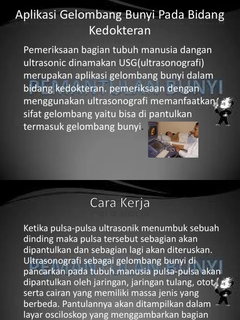 Aug 05, 2019 · fenomena dan aplikasi gelombang bunyi 1.najwa 2.wan fenomena pantulan gelombang bunyi fenomena pantulan gelombang bunyi gema terhasil apabila gelombang bunyi memantul kembali kepada pendengar dari suatu permukaan keras.bunyi yang dipantulkan ini menyerupai bunyi asal tetapi Pantulan gelombong bunyi atau gema boleh digunakan untuk menentukan kedudukan jarak sesuatu kedalaman dan mengesan lokas sesuatu objek. Gelombang bunyi ini akan bergerak ke dalam air dan terpantul kembali kepada kapal. Feb 07, 2016 · aplikasi gelombang bunyi dalam bidang industri dalam bidang industri yang banyak digunakan adalah teknik sonar (sound navigation and ranging) yaitu suatu teknik pantulan bunyi untuk navigasi. Teknik sonar dalam gelombang bunyi dapat di gunakan untuk, yaitu: